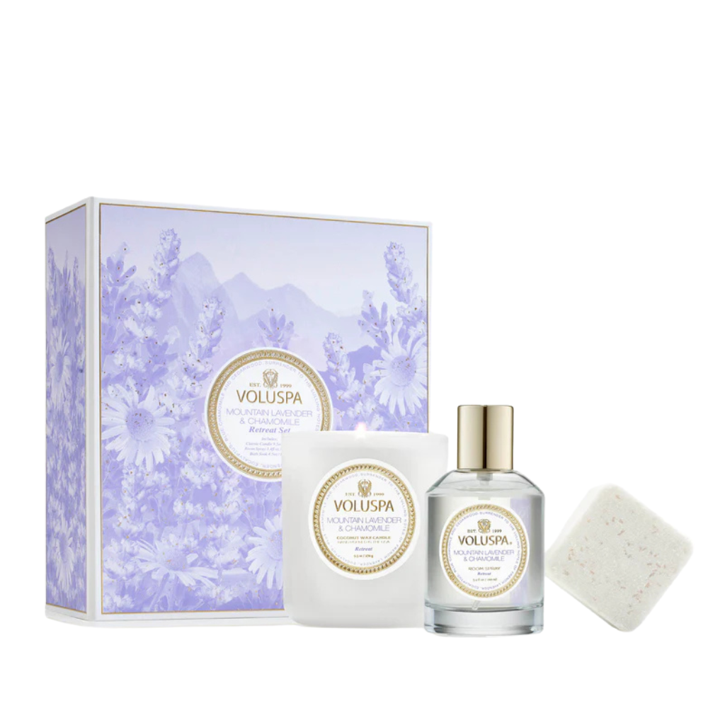 Incorpore la relajación a sus rituales diarios que satisfagan sus necesidades con la vela clásica, el aerosol para habitación y el baño de inmersión de Voluspa.