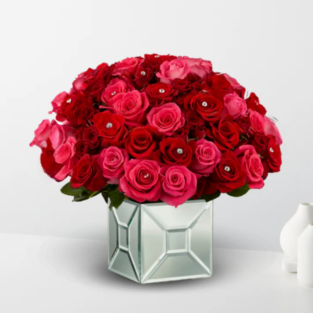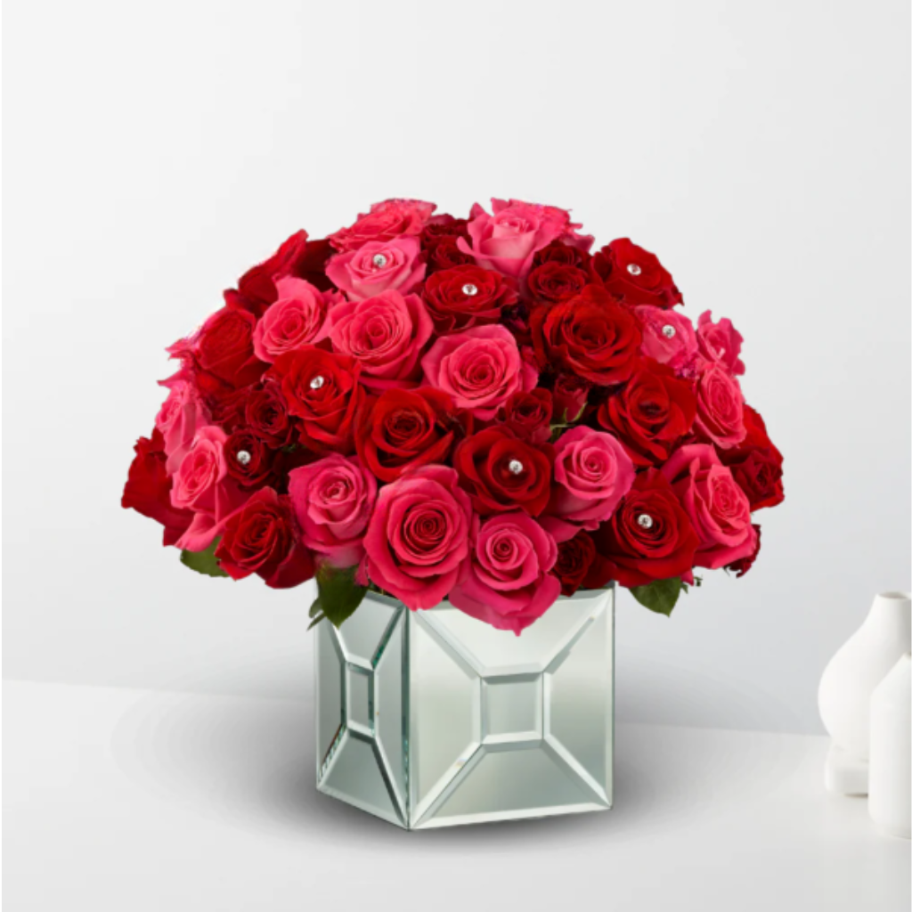 Designed to capture the heart, this bouquet goes above and beyond to create a space where modern style and love’s every wish unite. Hot pink roses, red roses, and red spray roses are arranged to perfection and embellished with sparkling stone accents at the center of select blooms, as well as, silver wires to create a fascinating looping effect, taking the average rose bouquet to a new level of sophistication. Tying everything together is the modern mirrored vase that brings light and love to this unique design. STANDARD bouquet includes 41 stems with vase. Approx. 15"H x 15"W. DELUXE bouquet includes 53 stems with vase. Approx. 16"H x 16"W.